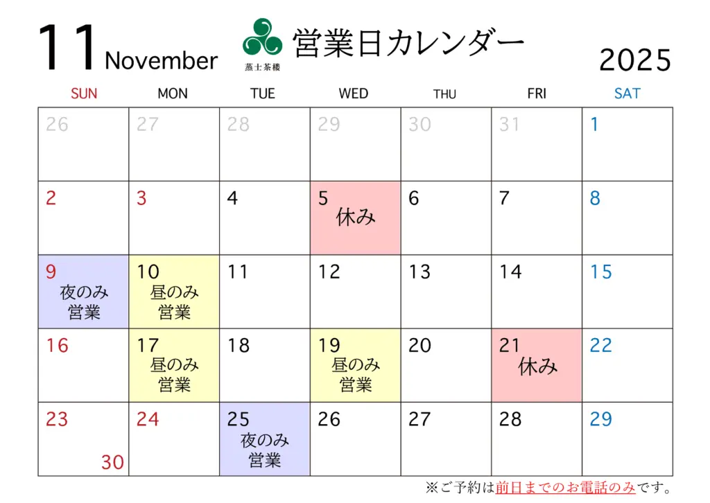 蒸士茶楼 令和7年11月度 営業日カレンダー