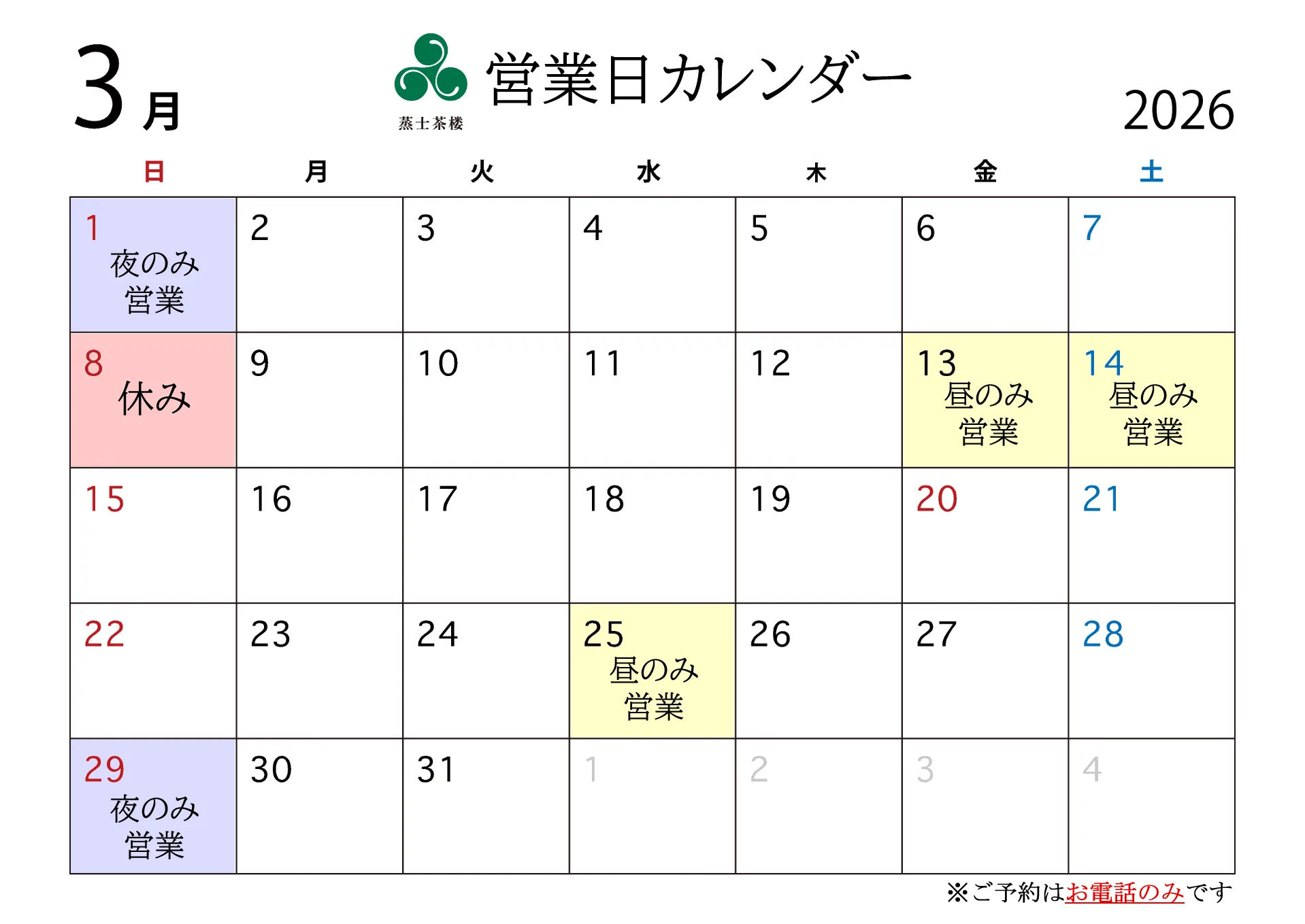 蒸士茶楼 令和8年3月度 営業日カレンダー