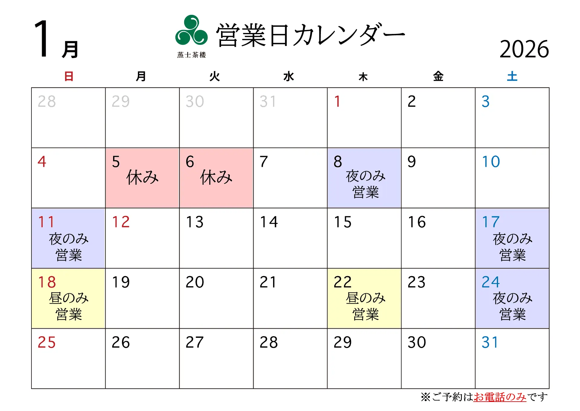 蒸士茶楼 令和8年1月度 営業日カレンダー
